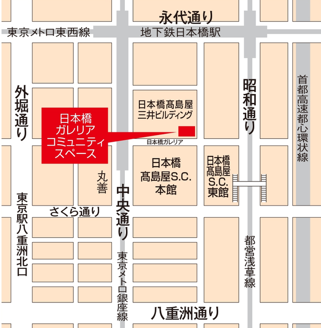 JR「東京駅」八重洲北口から徒歩5分 八重洲北口を出て外堀通りを横断し、さくら通りを中央通りに