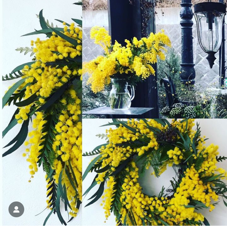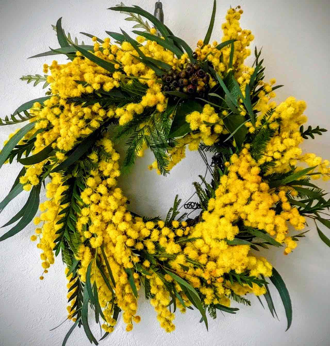 レモンイエローのふわふわとしたお花咲かせるミモザのリースでひと足先の春の訪れを